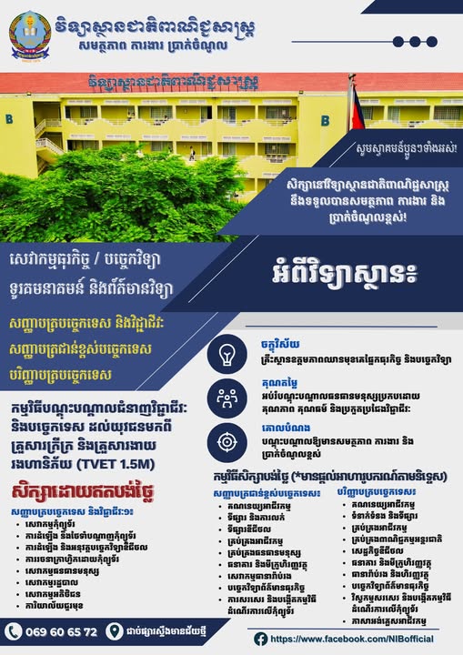 សេចក្កីជូនដំណឹងដល់ប្អូនៗថ្នាក់ទី១២ ដែលទើបប្រឡង ឱ្យបានជ្រាបថា វិទ្យាស្ថានចាប់ផ្តើមចុះឈ្មោះចូលរៀនឆ្នាំសិក្សាថ្មីចាប់ពីថ្ងៃនេះតទៅ ចូលរៀននៅថ្ងៃទី១៨ ខែតុលា ឆ្នាំ២០២៥.......