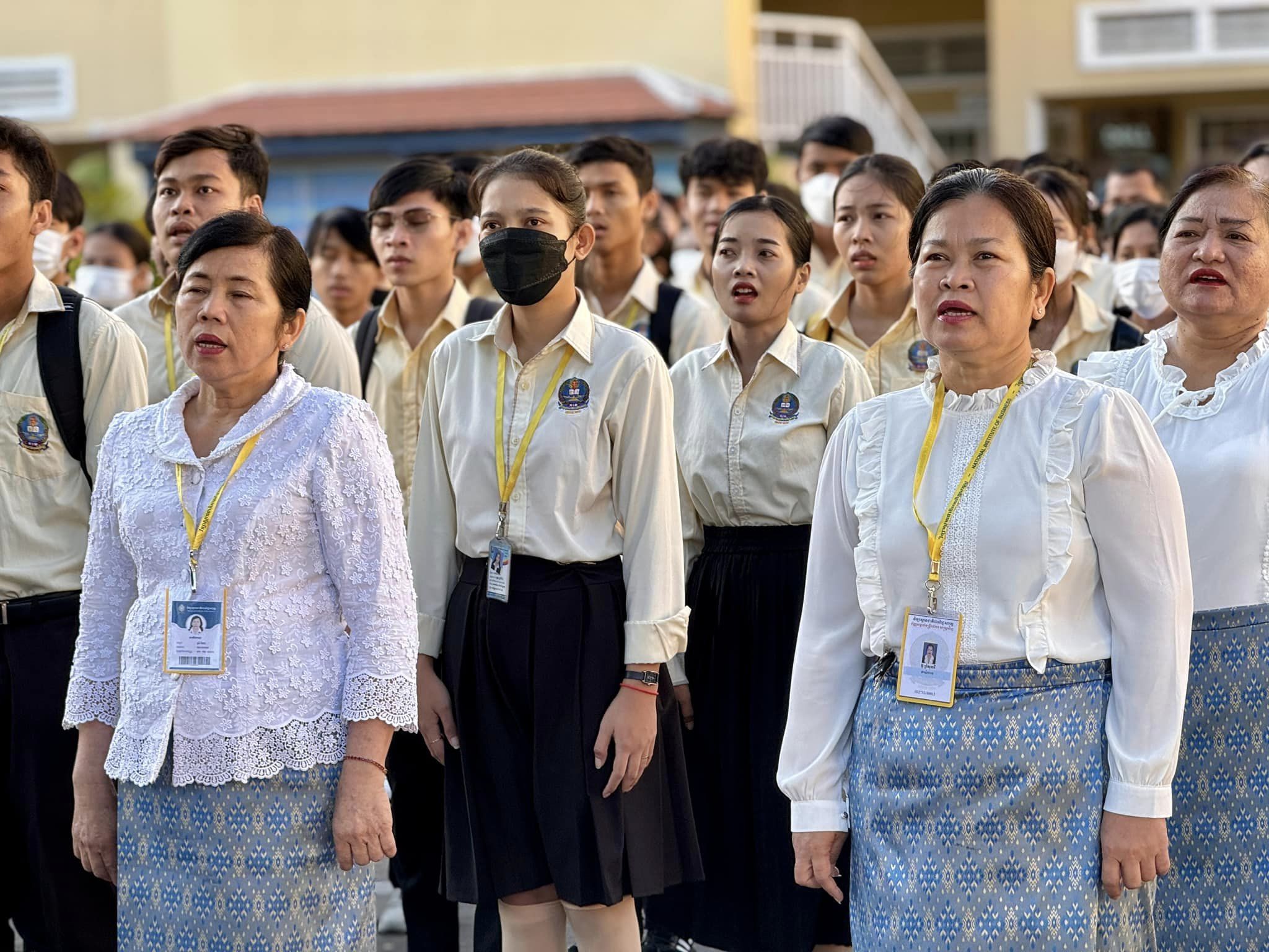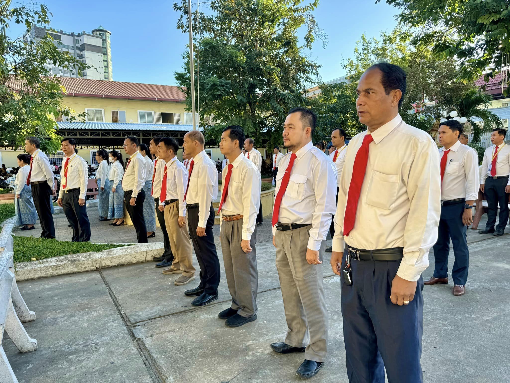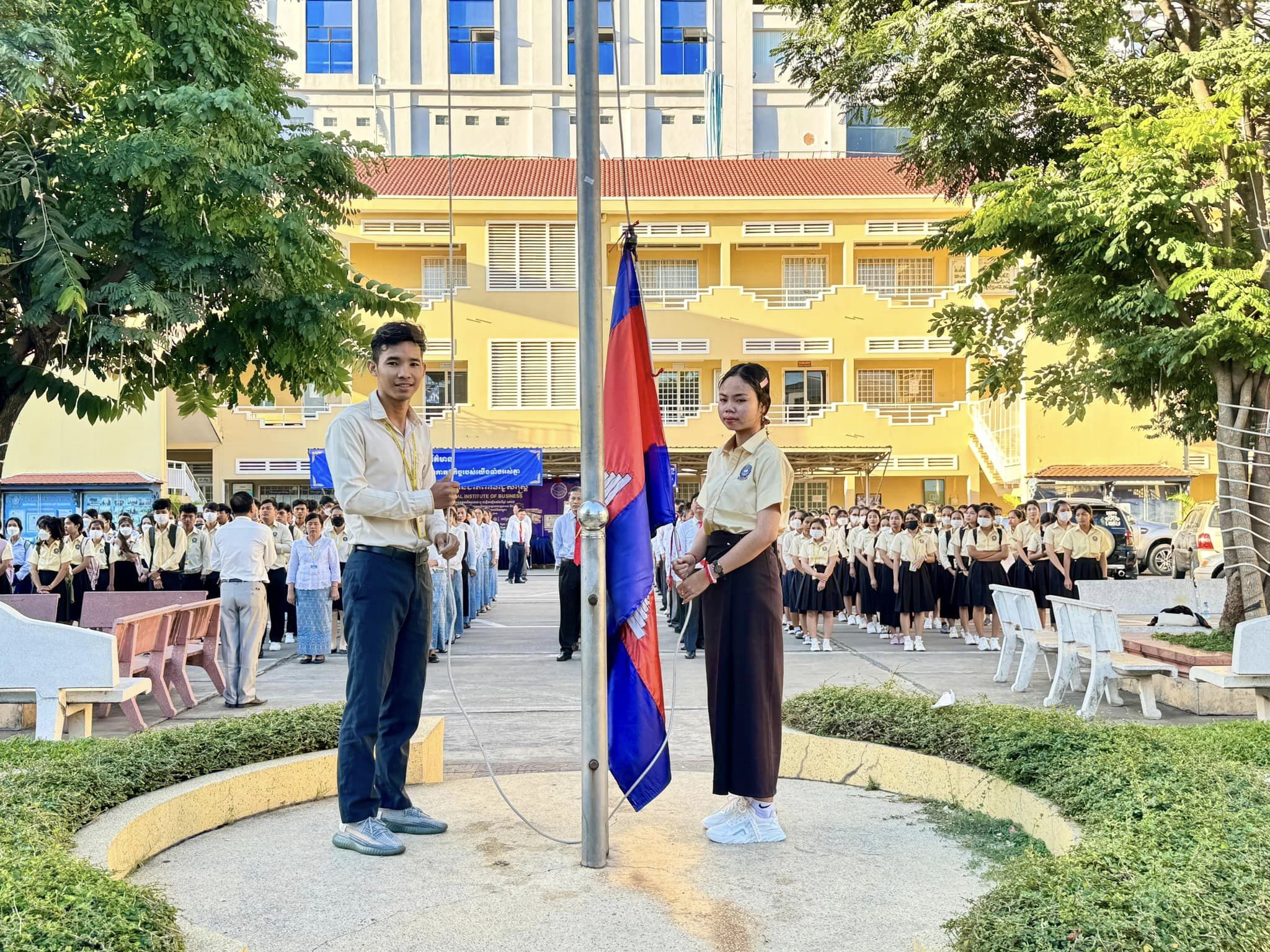 HE Tep Oeun, Director of the National Institute of Business, led the civil servants, teachers and students of the National Institute of Business to respect the flag of the Kingdom of Cambodia.