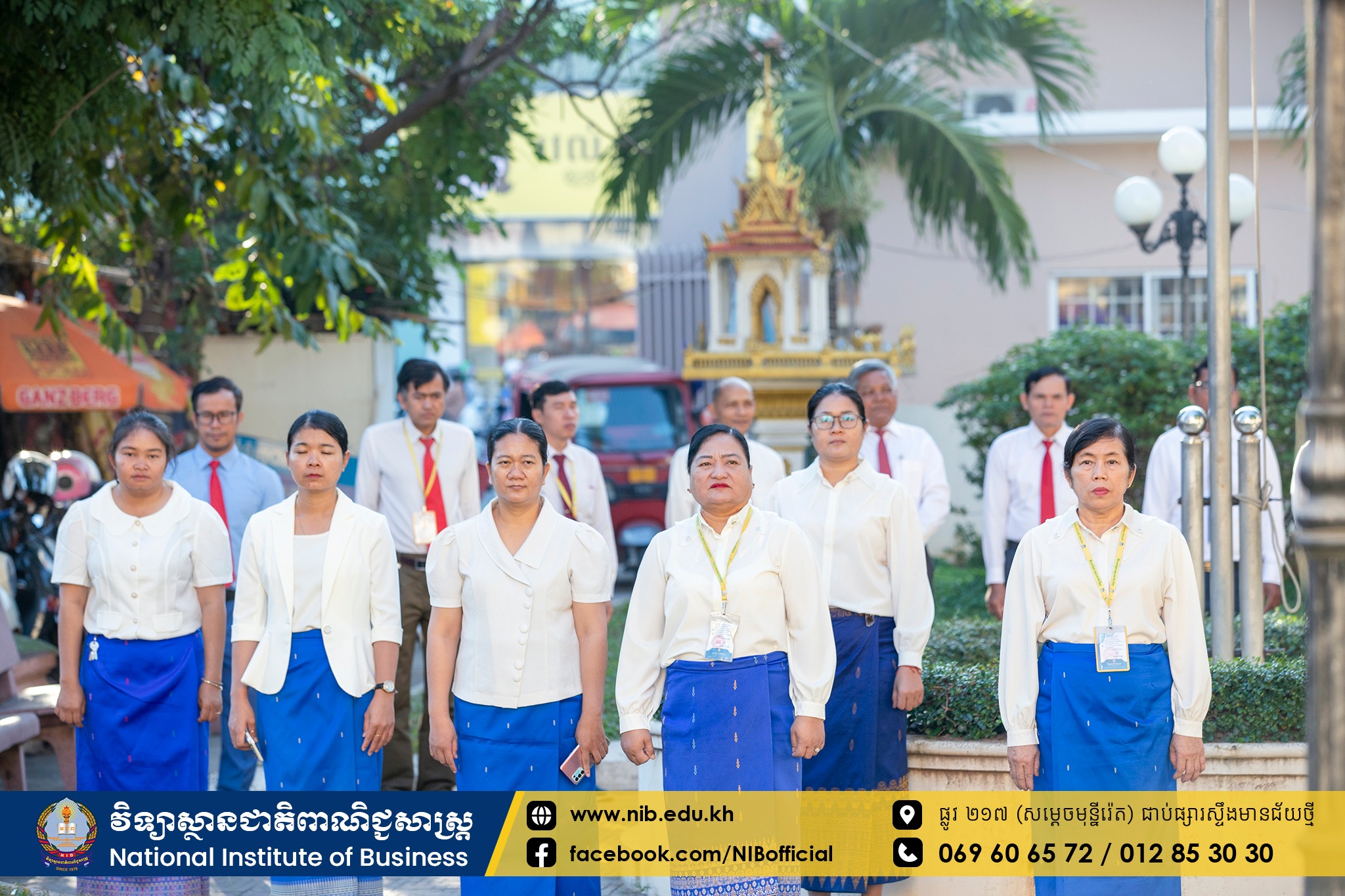 ឯកឧត្តម តឹប អឿន នាយកវិទ្យាស្ថានជាតិពាណិជ្ជសាស្រ្ត បានដឹកនាំមន្រ្តីរាជការ លោកគ្រូ អ្នកគ្រូ និស្សិតនិងសិក្ខាកាម នៃវិទ្យាស្ថានជាតិពាណិជ្ជសាស្រ្ត គោរពទង់ជាតិនៃព្រះរាជាណាចក្រកម្ពុជានិងស្មឹងស្មាធគោរពវិញ្ញាណក្ខន្ធព្រះបាទជ័យវរ្ម័នទី៧និងបុព្វបុរសខ្មែរ