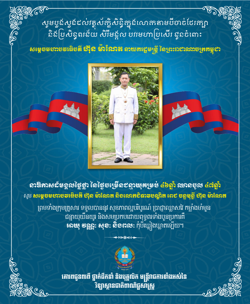 We, the leaders, civil servants, teachers and students of the National Institute of Business, please pray for the sacred objects in the world, please nurture and take care of all blessings to Samdech Moha Bovarithip Hun Manet and Lok Chumteav Dr. Pech Chan Mony, Hun Manet, and his family enjoy good health, strength, wisdom, longevity, and the four blessings of the Buddha: age, class, happiness, and strength.